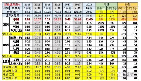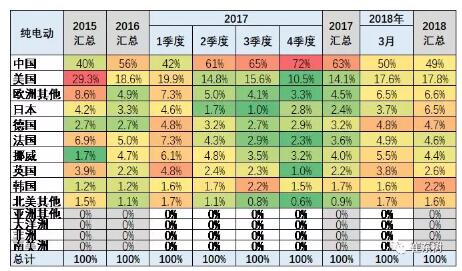 2018年1- 3月份,中國純電動乘用車的份額達到49%,較17年的1-3月份的42%份額大幅提升7個百分點。18年1到3月份,美國和法國德國等的新能源車市場份額同比都有所下降,而亞洲市場的日本和韓國的純電動車份額都有較好提升。