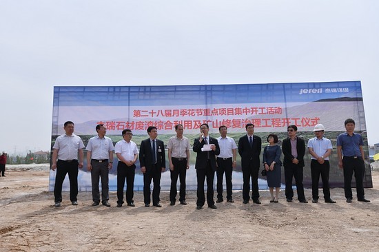柞村鎮(zhèn)黨委書記楊棟、柞村鎮(zhèn)鎮(zhèn)長邱維興、全國綠色礦山聯(lián)盟理事長杜根杰、杰瑞環(huán)保集團董事長王丕學、杰瑞集團高級副總裁李雪峰、杰瑞設計院院長楊波出席項目開工儀式并為項目奠基。