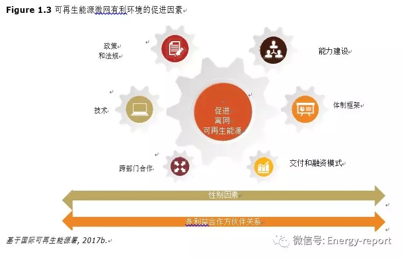 如圖1.3所示,為可再生能源微電網建立有利環境取決于幾個因素? 其中包括政策和法規?體制框架?交付模式和融資,技術解決方案,能力建設和跨部門合作(國際可再生能源署,2017a)? 其中一些因素相互關聯?