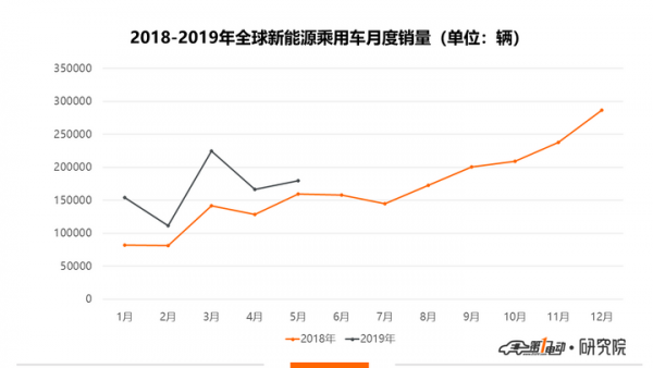 根據EVsales數據,2019年5月,包含純電動車型和插電式混合動力車型在內的全球新能源乘用車銷量同比僅增長12%,總計交付近18萬輛。