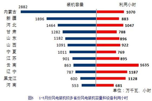 分類型看,1-5月份,全國水電設備平均利用小時為1300小時,比上年同期增加145小時。在水電裝機容量超過1000萬千瓦的8個省份中,水電設備平均利用小時均同比增加,福建和湖南同比增加超過600小時,分別增加636和661小時,廣東和云南同比增加超過300小時,分別增加306和304小時;全國火電設備平均利用小時為1728小時(其中,燃煤發電和燃氣發電設備平均利用小時分別為1783和971小時),比上年同期降低48小時。分省份看,全國共有14個省份火電設備利用小時超過全國平均水平,其中內蒙古和河北超過2000小時,海南、湖北、安徽、江西、陜西和甘肅也超過1900小時,而云南和西藏僅為654和124小時。與上年同期相比,共有12個省份火電利用小時同比增加,其中四川增加318小時,湖北、廣西、貴州、新疆、重慶和北京增加超過100小時,而廣東和云南下降超過300小時,分別降低402和309小時,青海、湖南、江西、上海、福建、陜西、天津、浙江、河南和遼寧下降也超過100小時。全國核電設備平均利用小時2839小時,比上年同期降低75小時;全國并網風電設備平均利用小時978小時,比上年同期降低24小時;全國太陽能發電設備平均利用小時532小時,與上年同期基本持平。