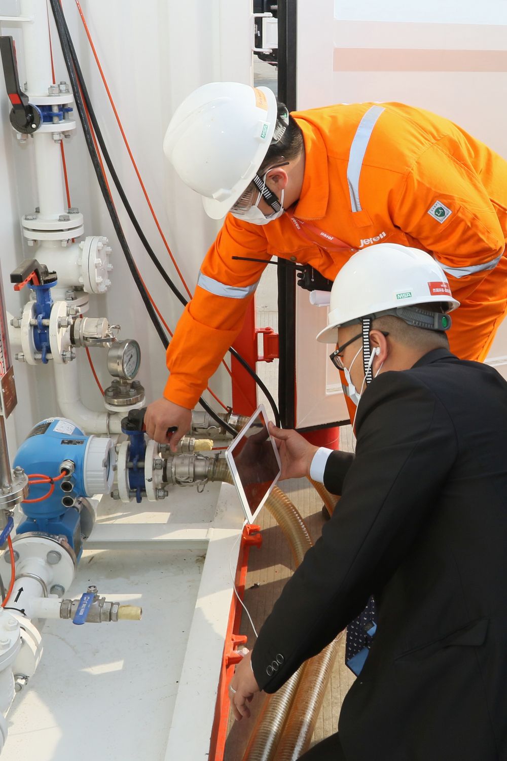 ↑技術(shù)人員使用平板電腦向沙特客戶直播設(shè)備細(xì)節(jié)和功能測(cè)試過(guò)程。