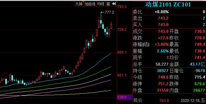 11月以來,動力煤期貨2101合約在站穩(wěn)600元整數(shù)位關(guān)口后,走出了一輪單邊上漲行情,截至12月10日,收盤價752.60,半個月時間漲超150元。12月11日,主力合約動力煤期貨價格再度觸及漲停,漲幅4%,報777.2元/噸,刷新歷史新高。創(chuàng)歷史新高之后,價格有所回落,但近幾日價格又重新開始反彈。期貨價格的大漲無疑放大了現(xiàn)貨價格的上漲情緒。據(jù)了解,發(fā)改委已約談鄭商所,要求采取措施平抑期貨波動。