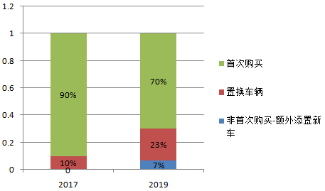 而這種趨勢并非空穴來風。麥肯錫在2019年的調查數據顯示,在受訪的購車者中,置換或買第二輛車的比例高達30%,比2017年提高了20%。此外,在購置下一輛車時,70%以上的受訪者會選擇購買更高端的車型。