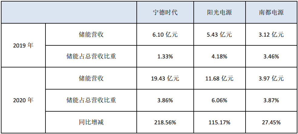 從上表中可以看出,寧德時代、陽光電源與南都電源2020年儲能業務營收都有增長,尤其是寧德時代和陽光電源,南都電源增速相對較慢。其中,寧德時代作為動力電池頭部企業,儲能營收增長速度最為明顯,是2019年的3倍以上,陽光電源也的儲能營收也實現了翻一番。