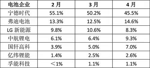 作為龍頭的寧德時(shí)代1-4月裝機(jī)量達(dá)到16.04GWh,前4個(gè)月總的市占率仍然超過(guò)中國(guó)市場(chǎng)裝機(jī)量的一半,達(dá)到50.7%,但如前所述,其自2月份以來(lái),市占率在逐漸下降。