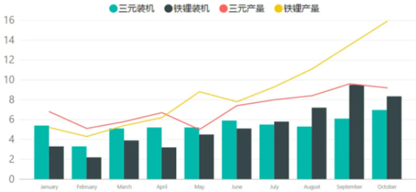 圖4 三元鐵鋰1-10月累計(jì)的對(duì)比