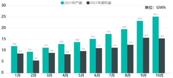 10月份,動(dòng)力電池產(chǎn)量共計(jì)25.1GWh,同比增長(zhǎng)191.6%,環(huán)比增長(zhǎng)8.4%;動(dòng)力電池裝車量15.4GWh,同比上升162.8%,環(huán)比下降1.8%。