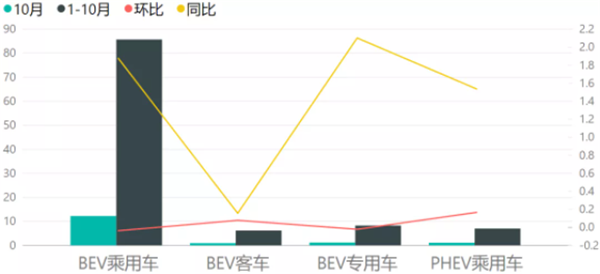 我想從10月和1-10月兩個(gè)圖表來看整體的使用情況,10月份最大的用量還是去了純電動(dòng)乘用車,裝機(jī)量為12.219GWh,占比79.26%。而單臺(tái)車10-30kWh的插電混動(dòng)的用量在10月份也達(dá)到了1.092GWh,充分反映了這個(gè)細(xì)分市場(chǎng)的增速,環(huán)比也保持了16%的增速。