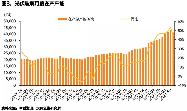 根據(jù)卓創(chuàng)資訊的統(tǒng)計(jì),2021年初超白壓延在產(chǎn)產(chǎn)能29540t/d,至今達(dá)到41260t/d,凈增量達(dá) 11720t/d,Q4產(chǎn)能或持續(xù)增加。3月后光伏玻璃價(jià)格出現(xiàn)大幅下行,疊加“雙碳”背景下地方政 府能耗指標(biāo)或有收緊趨向,當(dāng)前不能排除后續(xù)產(chǎn)線延期投產(chǎn)可能,據(jù)卓創(chuàng)資訊,目前行業(yè)內(nèi)少數(shù) 產(chǎn)線的點(diǎn)火計(jì)劃延期。