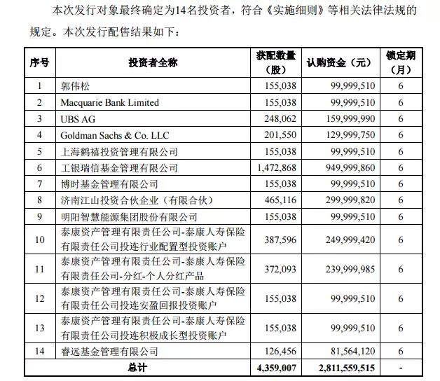 12月14日,邁為股份披露定增情況報告書,確定此次發(fā)行價格為645元/股,發(fā)行數(shù)量約為435.9萬股,募資總額約為28.12億元;發(fā)行對象最終確定為14家,其中明陽智能獲配近1億元。
