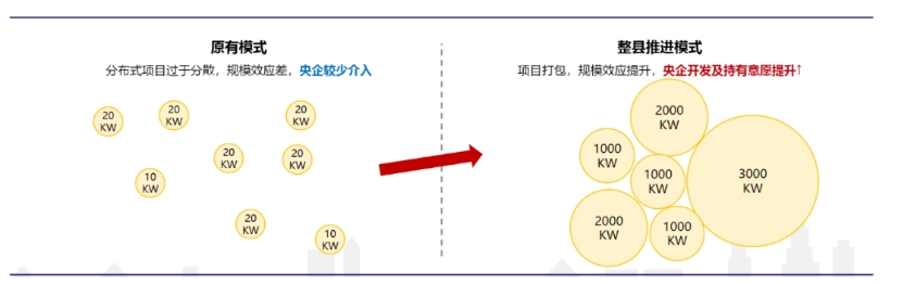 實際上,分布式光伏中,央企更愿意做資產并購,對于前期繁瑣的開發建設其實并不愿意參與。整縣推進以后,央國企把分布式光伏納入收購目標,正因為有央國企的收購托底,民企可以開發更多收益率相對更低的項目,與央國企形成互補的關系。此外,整縣分布式電站日常運維依然比較分散,因此大部分國企央企選擇將運維外包給民營企業,民營企業也可以獲得單瓦3-4分的運維費用。