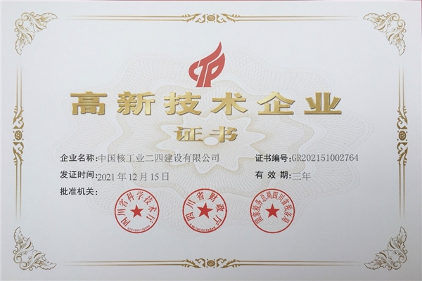 中核二四獲得國(guó)家高新技術(shù)企業(yè)證書