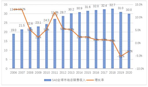 圖-2006-2020年SAS全球市場總銷售收入(億美元)及增長率