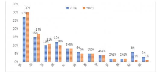 行業收入占比前三名仍然是銀行、政府、保險,但與2016年相比,2020年這三個行業的占比都有所上升,收入有向這三個行業集中的趨勢。