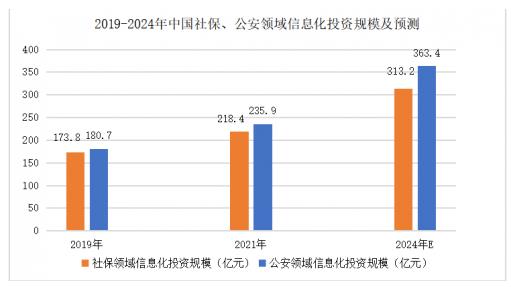 其中,社保領域,近年來在金保工程以及醫療體制改革推動下,各級政府社保信息化建設投資顯著增加;賽迪CCID統計,2021年我國社保領域信息化投資規模約218.4億元,2019年至2021年間復合年增長率為12.1%,預計到2024年社保領域信息化投資規模將達到313.2億元,復合年增長率12.8%。公安領域,在金盾工程、平安城市建設不斷推進以及“放管服”政策驅動下,公安領域信息化投資穩定增長;賽迪CCID統計,2021年我國公安領域信息化投資規模約235.9億元,2019年至2021年間復合年增長率為14.2%,預計到2024年公安領域信息化投資規模將達到363.4億元,復合年增長率15.5%。