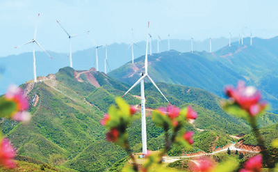 近年來,江西省贛州市興國縣積極推進綠色低碳減排工作,大力發展風力發電等綠色產業。圖為4月20日,矗立在群山之中的興國縣茶園鄉十八排風電場的發電機組。