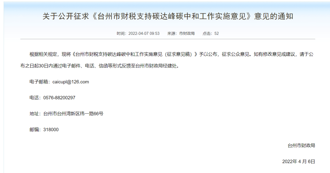 風芒能源獲悉,近日,浙江省臺州市發布了關于公開征求《臺州市財稅支持碳達峰碳中和工作實施意見》意見的通知。