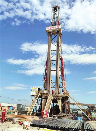 近日,記者從市區(qū)出發(fā)向東沿著津?qū)幐咚伲贿^(guò)半個(gè)小時(shí)車(chē)程,來(lái)到寧河區(qū)北淮淀示范鎮(zhèn)建設(shè)現(xiàn)場(chǎng)。遠(yuǎn)遠(yuǎn)看到示范鎮(zhèn)一期安置房北側(cè)的空地上,一座50多米高的鉆井架聳立在藍(lán)天下,懸吊在井架上的鉆桿正旋轉(zhuǎn)著向地下挺進(jìn)。