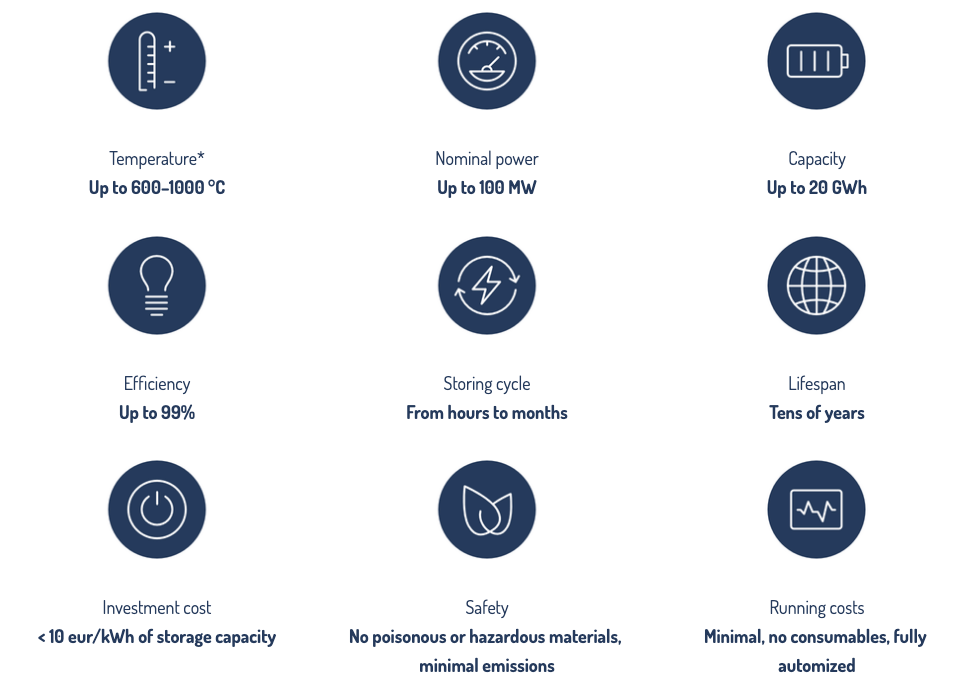 該公司在電視采訪中告訴記者,裝置的效率非常高。極夜能源首席技術官馬庫·伊洛寧(Markku Ylönen)說,“把電能轉化為熱能很容易”,但把熱能轉化為電能,需要汽輪機和更復雜的東西。如果只是用于供熱、采暖,非常簡單。該公司聲稱裝置的效率因子高達99%,能以最低損耗持續儲熱數月,壽命長達幾十年。