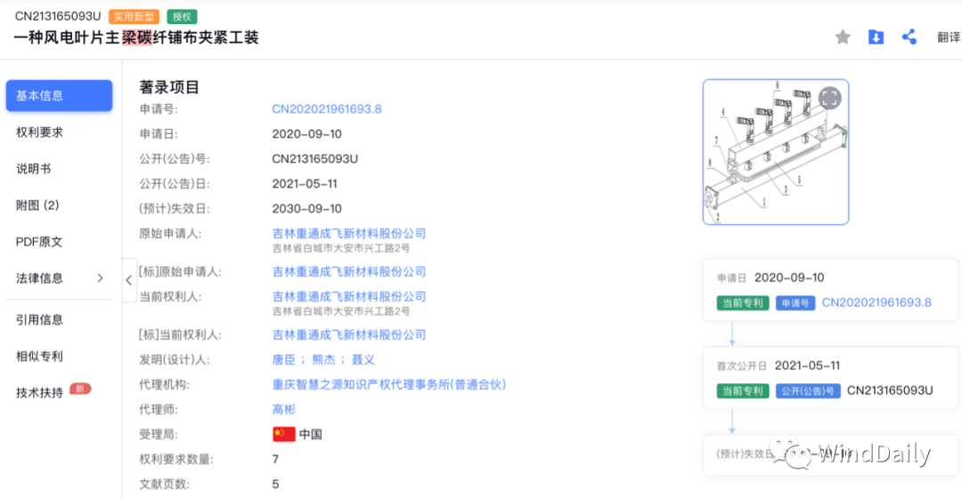 重通成飛2020年也申請了風電葉片主梁碳纖維相關專利。