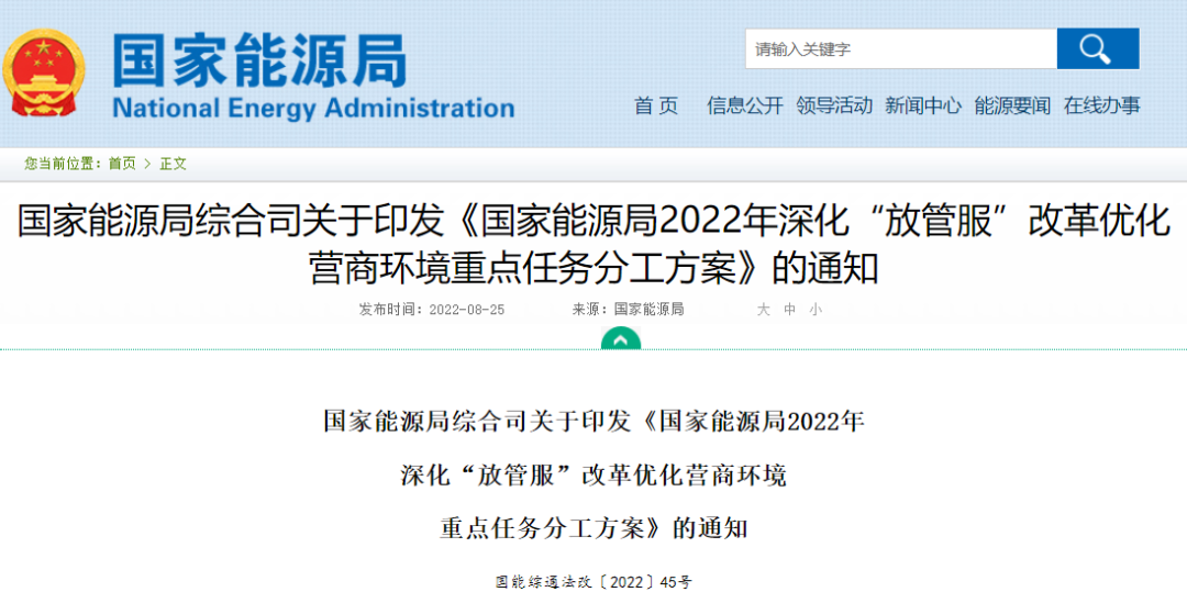國家能源局近日印發(fā)《國家能源局2022年深化“放管服”改革優(yōu)化營商環(huán)境重點任務(wù)分工方案》(簡稱《方案》)。