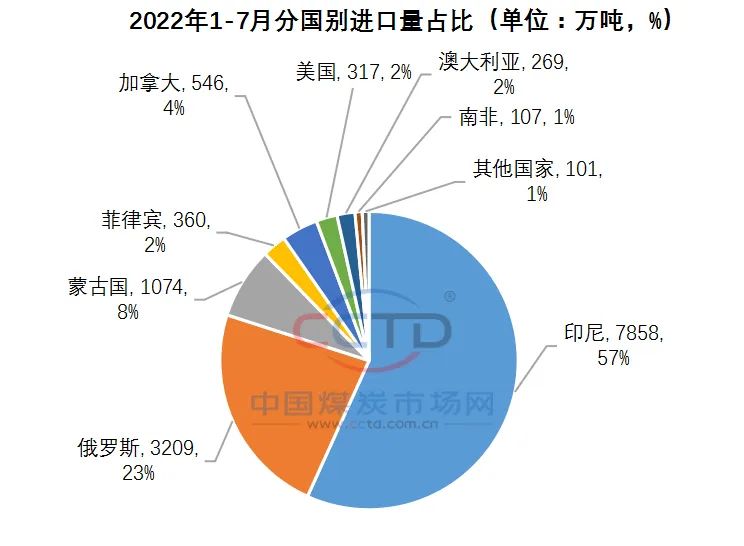 今年1-7月份,我國(guó)累計(jì)進(jìn)口煤炭1.4億噸,同比下降18.5%。從前五大供應(yīng)國(guó)來(lái)看,印度尼西亞煤占比57%,俄羅斯煤占比23%,蒙古煤占比8%,加拿大煤占比4%,菲律賓煤占比2%。