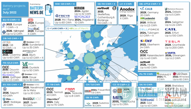 根據(jù)上游出版商Battery-News的數(shù)據(jù),截至2022年7月,歐洲規(guī)劃了1416GWh鋰離子電池年度總產(chǎn)能(下圖顯示的是為該出版商制作的信息圖)。