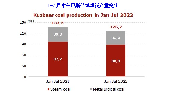 據當地的煤炭工業部門統計數據顯示,2022年1-7月,俄羅斯庫茲巴斯盆地煤炭企業產量累計為1.257億噸,比上年同期減少1180萬噸,同比下降8.9%。其中,動力煤產量8880萬噸,比去年同期減少890萬噸,同比下降9.1%;煉焦煤產量3690萬噸,比去年同期減少290萬噸,同比下降7.3%。