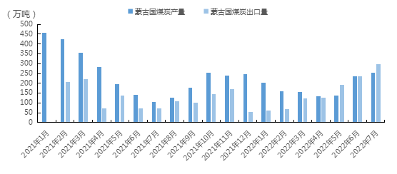 根據蒙古國國家統計局(National Statistical Office of Mongolia)最新發布數據:蒙煤7月產量255.77萬噸,環比上升8.89%,和去年同期相比,同比上升142.8%;截至2022年7月累計產量1278.93萬噸,累計同比下降34.90%。在7月蒙古國出口煤炭297.12萬噸,環比增加26.04%,和去年同期相比,同比上升319.36%;2022年累計出口1105.25萬噸,累計同比增加7.18%。蒙古焦煤進口額達15.6億美元,同比增長134.5%。煤炭進口平均價格為255.9美元/噸,同比上漲79美元。蒙古焦煤進口額達15.6億美元,同比增長134.5%。煤炭進口平均價格為255.9美元/噸,同比上漲79美元。