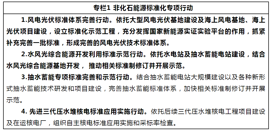 ——建立完善以光伏、風(fēng)電為主的可再生能源標(biāo)準(zhǔn)體系,研究建立支撐新型電力系統(tǒng)建設(shè)的標(biāo)準(zhǔn)體系,加快完善新型儲能標(biāo)準(zhǔn)體系,有力支撐大型風(fēng)電光伏基地、分布式能源等開發(fā)建設(shè)、并網(wǎng)運(yùn)行和消納利用。