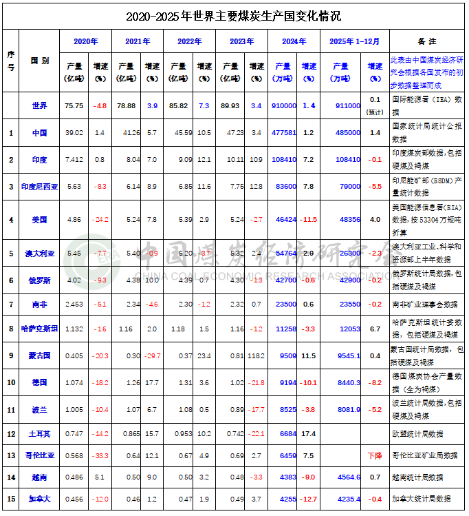 • 2025年世界主要煤炭生產國產量變化情況
