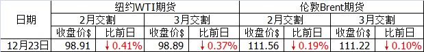 由于圣誕節來臨,在連日上漲之后部分交易者選擇落袋為安,因此當日紐約WTI、倫敦布倫特價格都有小幅下降。但是目前導致油價上漲的不安因素仍未消除:法國道達爾三座煉廠工人持續罷工、利比亞石油出口減少約100萬桶/日(當地有武裝組織在尋求更大的自治權)、南蘇丹動亂導致其24.5萬桶/日的石油產量受到威脅等(中石油已經將工人從油田撤出)。