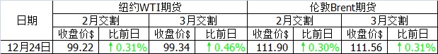 紐約WTI價格和倫敦布倫特價格當日結束前一日的小幅下跌繼續扭頭向上。根據路透社的調查預測,截至20日的美國原油庫存比前一周減少230萬桶,連續4周出現下降。餾分油減少40萬桶,汽油增加130萬桶。25日因圣誕節原因紐約商品交易所將休市。美國能源信息署石油庫存周報也將推遲至27日公布。當日早上公布的11月美國耐久財數據和同月的新建獨棟住宅銷售量都好于市場預期。