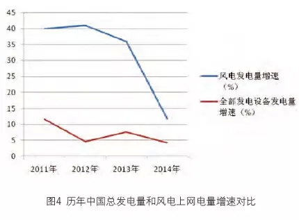 然而,由圖4可以看出,2014年中國風電上網電量的增長幅度在與歷年相比時,明顯處于下降趨勢。其增幅雖然超過了10%,但與2011年、2012年的增幅超過40%相差甚遠。與其相比,中國全國發電量的增幅下降并沒有那么明顯,雖然歷年總體也呈現下降的趨勢。