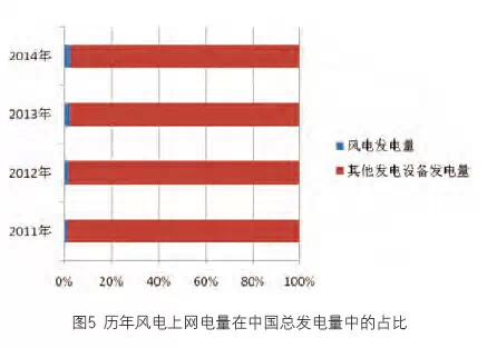 圖5顯示的是歷年中國風電上網電量占全國發電量的比例,由2011年的1.67%到2014年2.8%,呈現逐年增加的趨勢。