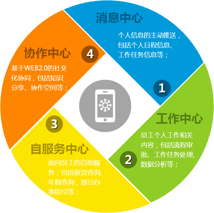 在員工的辦公App中構建消息中心、工作中心、自服務中心、協作中心。個人辦公以員工為核心,實現“工作找人”,將與員工相關的業務應用聚合起來,實現“一站式”便捷辦公,支持企業的扁平化管理和社交化協同。
