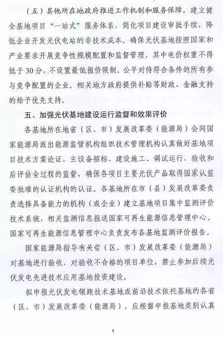 每個省(區(qū)、縣)可申報3個基地,總規(guī)模不超過2G瓦。2016年光伏發(fā)電未達到最低保障小時數的省(區(qū)、縣)不得申請。已建成未驗收以及在建基地所在市(縣)級區(qū)域不安排新建基地。