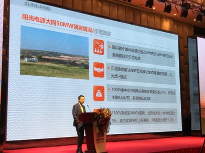 胡兵開門見山,以分享者的姿態,將陽光電源在參與大同光伏“領跑者”基地建設近兩年來的努力和思考,向與會來賓和盤托出。胡兵介紹稱,陽光電源憑借二十年新能源發電領域的技術積累和創新能力,將直流1500V光伏技術、跟蹤系統技術、生態修復技術等前沿創新成果,充分展示和運用在“領跑者”基地項目建設中。