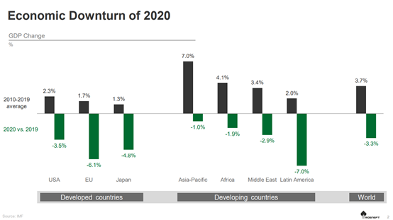 受大流行病的影響,全球經濟在2020年出現了創紀錄的崩潰——在經歷了每年近4%的十年增長后,全球GDP下降了3.3%,即3萬億美元,這相當于法國和英國的GDP。
