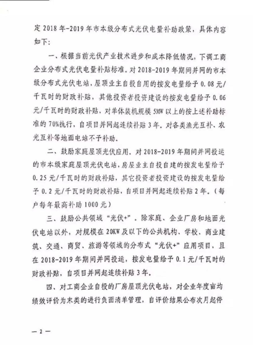 6月4日,嘉興發布了《關于進一步實施嘉興市本級分布式光伏電量補貼政策的通知》,明確提出鼓勵家庭屋頂光伏應用,對2018-2019年期間并網投運的市本級家庭屋頂光伏電站,房屋業主自投自建的按發電量給予0.25元/千瓦時的財政補貼,其它投資者投資建設的按發電量給予0.2元/千瓦時的財政補貼,自項目并網起連續補貼2年。(每戶每年最高補助1000元)。