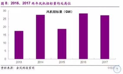 2017年棄風率出現(xiàn)明顯下降,同時,2016、2017兩年的風機招標量均處于25GW以上的高位。大量的已招標項目使得投資意愿能快速落地,而棄風率的改善則促進運營商將已招標項目啟動建設(shè)。棄風率改善、招標量提升,指示2018年風電行業(yè)新增裝機將迎來大幅反轉(zhuǎn)。