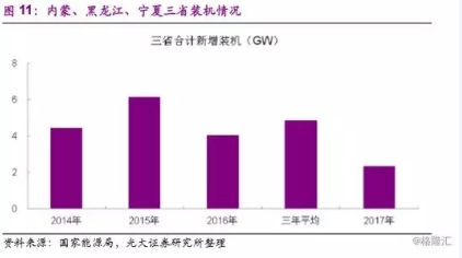 整體來看,我們預計解禁三省、尤其是有大規(guī)模能源基地的內(nèi)蒙,2018年新增裝機將有5GW以上的增長,而分散式風電將貢獻1-2GW的新增裝機,2018年全國風電新增裝機將達到25-26GW,同比增長30%以上。