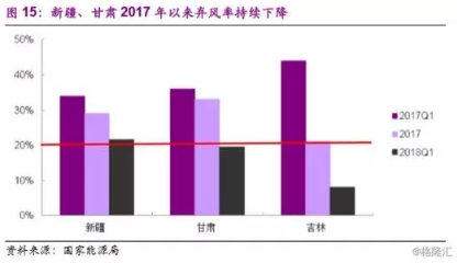新疆、甘肅兩大傳統(tǒng)裝機大省有望解禁,為2019年新增裝機提供有力保障。從2018年一季度棄風率情況來看,新疆和甘肅的棄風率已改善至20%的紅線附近。考慮到一季度通常是棄風率最高的季度,可以預期新疆、甘肅全年棄風率有望降至20%以下,2019年將放開紅色預警限制,可以恢復風電建設(shè),為2019年全國新增裝機的增長提供有力保障。