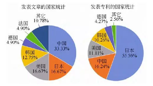 圖2. 2017 年不同國(guó)家發(fā)表的固體鋰電池文章及專利的數(shù)據(jù)統(tǒng)計(jì)