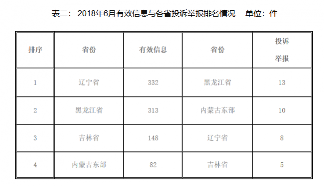 2018年6月,從12398能源監管熱線收到的有效信息數量來看,遼寧省均居首位;從投訴舉報數量來看,黑龍江省居首位。(詳細情況見表二)