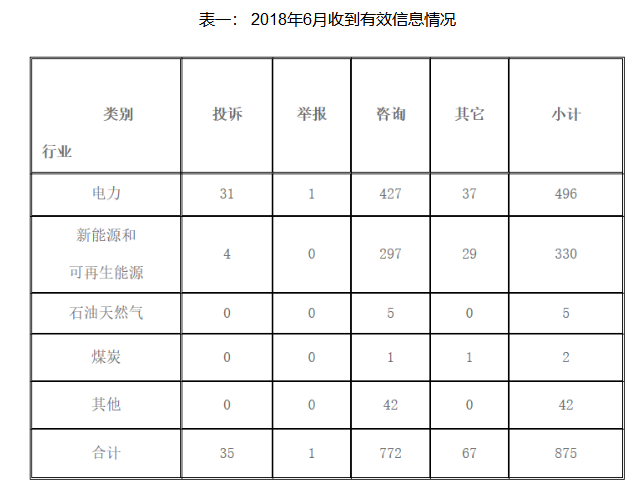 2018年6月,12398能源監管熱線投訴舉報有效信息875件。按訴求性質分類,投訴35件,占有效信息的4.00%;舉報1件,占有效信息的0.11%;咨詢772件,占有效信息的88.23%;其他方面67件,占有效信息的7.66%。