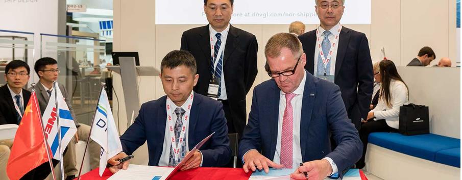 新大洋造船有限公司總經(jīng)理徐斌(左)和DNV GL大中國(guó)區(qū)總經(jīng)理科來在挪威海事展上簽署JDP協(xié)議。后排:SUMEC船舶公司總經(jīng)理徐剛(左)和SUMEC船舶公司技術(shù)經(jīng)理李國(guó)華。