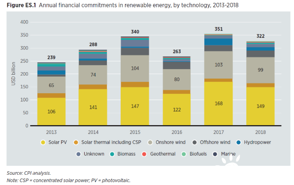 隨著技術(shù)成本降低,2018年可再生能源投資降低,但總裝機(jī)繼續(xù)增長(zhǎng)。