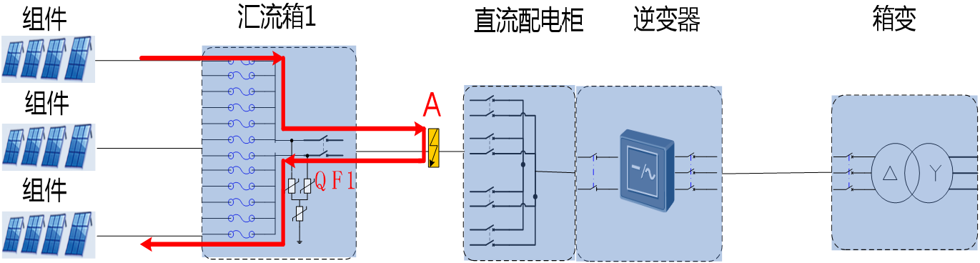 如上圖的A點(diǎn)發(fā)生短路故障,紅色故障回路:QF1為匯流箱斷路器,額定電流500A,由于組件的短路電流在480A左右,QF1一直不會(huì)脫扣,持續(xù)輸出直流能量到故障點(diǎn),維持電弧燃燒,擴(kuò)大火災(zāi)事故。